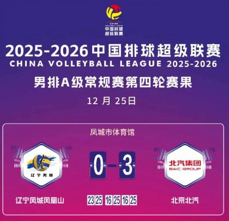 12月25日,2025-2026赛季中国男排超等联赛惯例赛参加第四轮争夺,北京北汽男排客场3比0轻取辽宁凤城男排,新赛季初度取得两连胜。