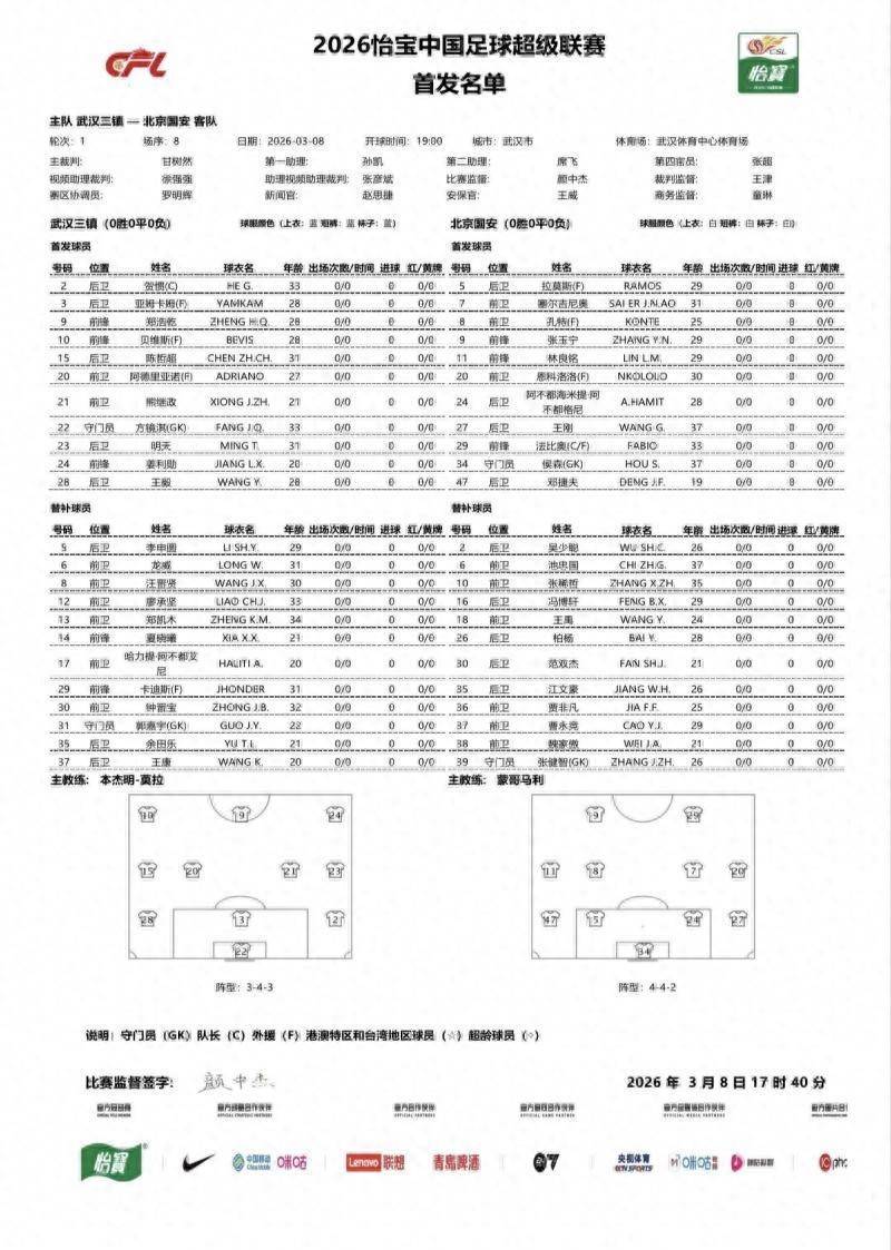 8日晚7点,北京国安队将在中超首轮比赛中客场挑战武汉三镇队,赛前一小时,国安公布了首发名单,由于李磊、茹子楠和达万的受伤,此役主帅蒙哥马利在首发名单中作念出了相应转机,其中19岁的左后卫邓捷夫迎来国安首秀体育集锦,他顶替的恰是李磊的位置,宿将王刚、外助孔特和边锋林良铭不异得回先发的契机。