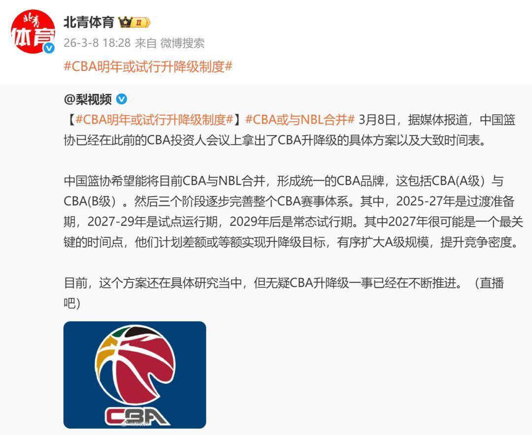 中国篮协但愿能将当今CBA与NBL统一,酿成搭伙的CBA品牌,这包括CBA(A级)与CBA(B级)。然后三个阶段渐渐完善扫数这个词CBA赛事体系。其中,2025-27年是过渡准备期,2027-29年是试点开动期,2029年后是常态试行期。其中2027年很可能是一个最环节的手艺点,他们磋议差额或等额齐全升左迁主义,有序扩大A级限制,升迁竞争密度。