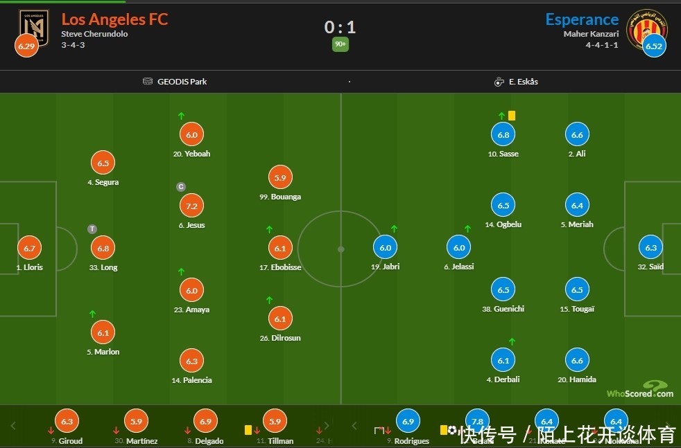 本场比赛洛杉矶FC上半场2粒进球,都因为越位在先被取消,下半场贝莱利打入全场独一进球,匡助突尼斯但愿1-0笑到了临了,跟着终场哨声的响起,前两轮全败的洛杉矶FC依然提前出局,而突尼斯但愿末轮将会和切尔西径直对话,得胜的一方将概况联袂弗拉门戈晋级。