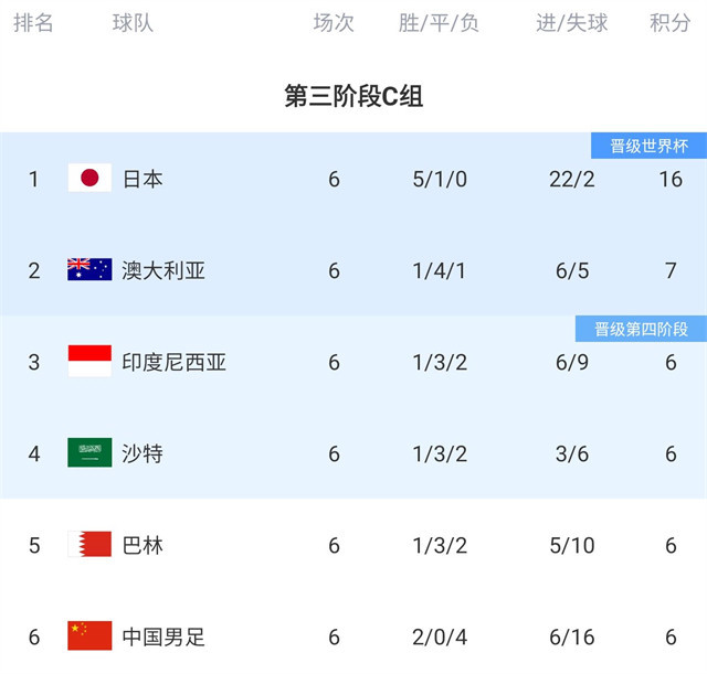世初赛亚洲区第三阶段,中国队场地的C组照旧截止了扫数第六轮的比赛,中国队得益一好一坏音问:好音问是2至6名同积6分皆很弱,坏音问则是国足新净胜球损失暂时垫底。